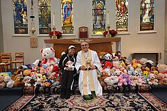 More than 125 Bears, lambs, dogs, kittens etc. were gathered together for the Grace Church Annual Teddy Bear Sunday.  Pictured are “Inspired by Grace” Outreach Chairperson Charisse Isip and our Rector, Fr. Walter Hillebrand.  Many thanks to our parishioners, Early Childhood Center Parents and friends of Grace for their contributions to this special event.  The stuffed animals will be distributed to children who need a little love and hope at area hospitals. God bless you all. (photo by ernest isip)
